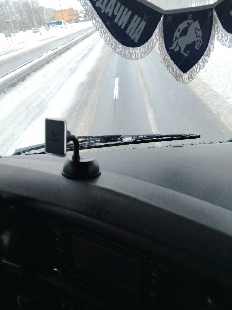 Вакуумная присоска диаметром около 65 мм крепится всегда надежно на лобовое стекло. С установкой на приборную панель могут быть проблемы из-за слишком мягкого материала изготовления торпедо или отсутствия абсолютно ровного участка.